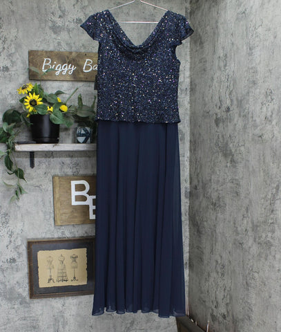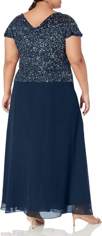Flutter-sleeve bodice of a mock two-piece gown finished with a diaphanous, swirling chiffon skirt. Finished with a cowl neckline