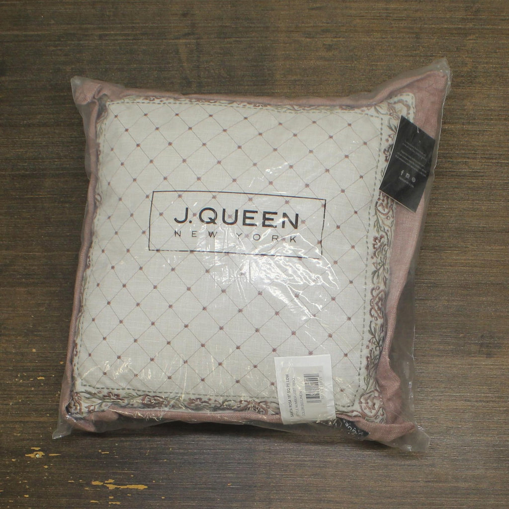The Safia 18 in. Throw Pillow features a textured faux linen with shades of blush, dusty sage and soft cream. An embroidered lattice starburst dot detail is framed and mitered on 4 sides with an intricately embroidered floral stripe and flange trim. Making it a timeless accent to your home decor and it coordinates with the Safia bedding and window treatments.