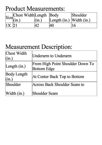 | Size | Chest Width (in.) | Length (in.) | Body Length (in.) | Shoulder Width (in.) |
