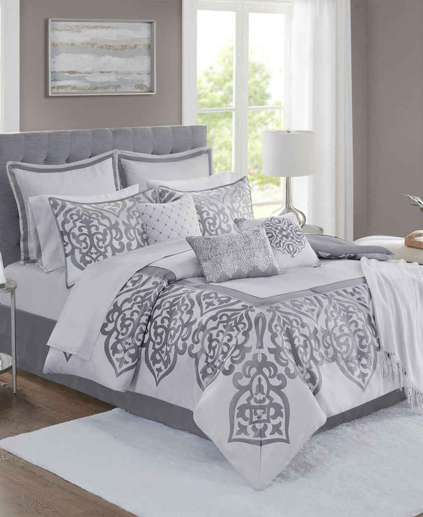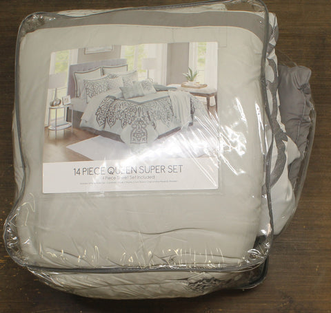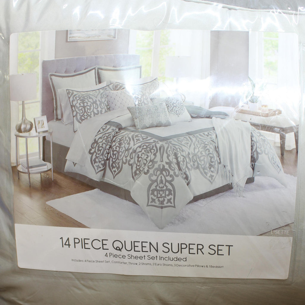 Includes 14 pieces. 1 Comforter, 1 Flat Sheet, 1 Fitted Sheet, 2 Pillowcases, 1 Throw, 2 Shams, 2 Euro Shams, 3 Decorative Pillows and 1 Bedskirt. Effortlessly add elegance to any bedroom with the sophisticated damask jacquard border pattern featured on this Lisette comforter set. Plus, the included decorative pillows, European shams and cozy throw bring a whole new level of style and comfort to any setting.