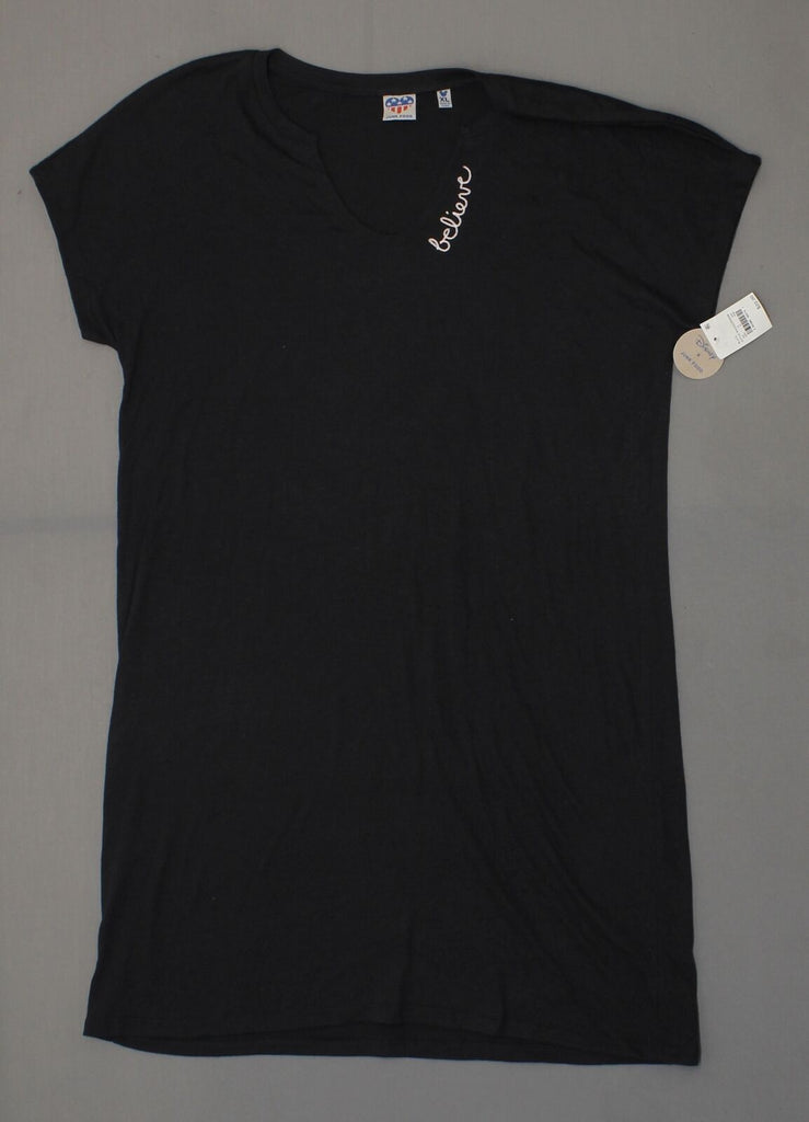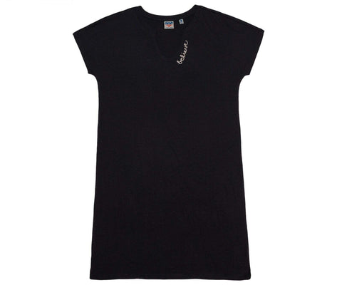 A simple T-shirt dress with a touch of inspirational flair why not? Whether you re headed to a casual coffee date or hitting the mall for a girls day, the Mickey Mouse Believe Embroidered T-Shirt Dress from Junk Food puts a small, yet charming twist on your standard T-shirt dress. Short sleeves and a keyhole V-neck make for a casual look you can pair with loafers or lace-up sneaks, and the black color lets you accessorize to your heart s content. Last but not least, dainty stitching spells out Believe along the neckline for the prettiest touch of artisanal detail. Fashion-forward encouragement? You've got it in this short-sleeve T-shirt dress.