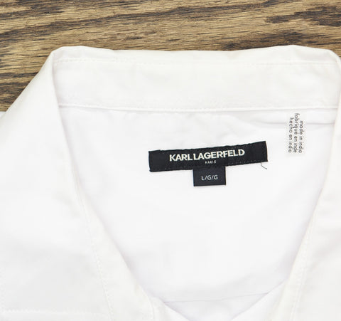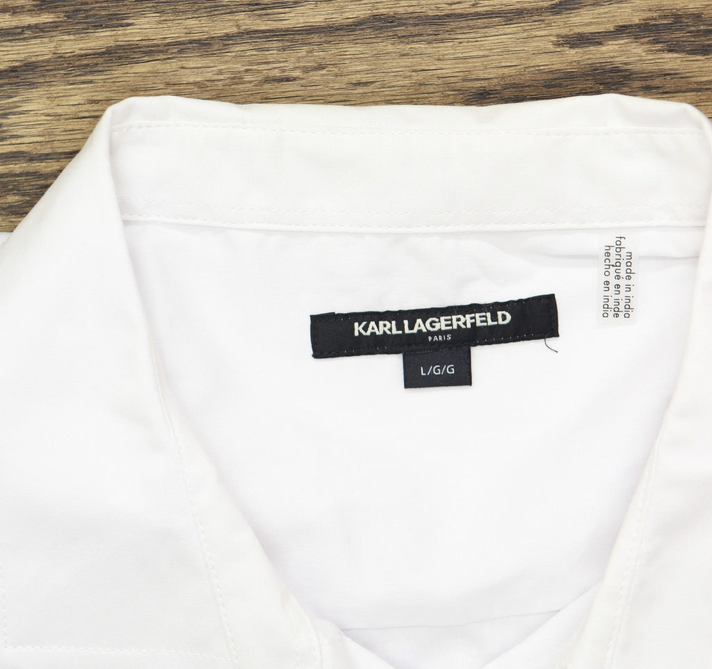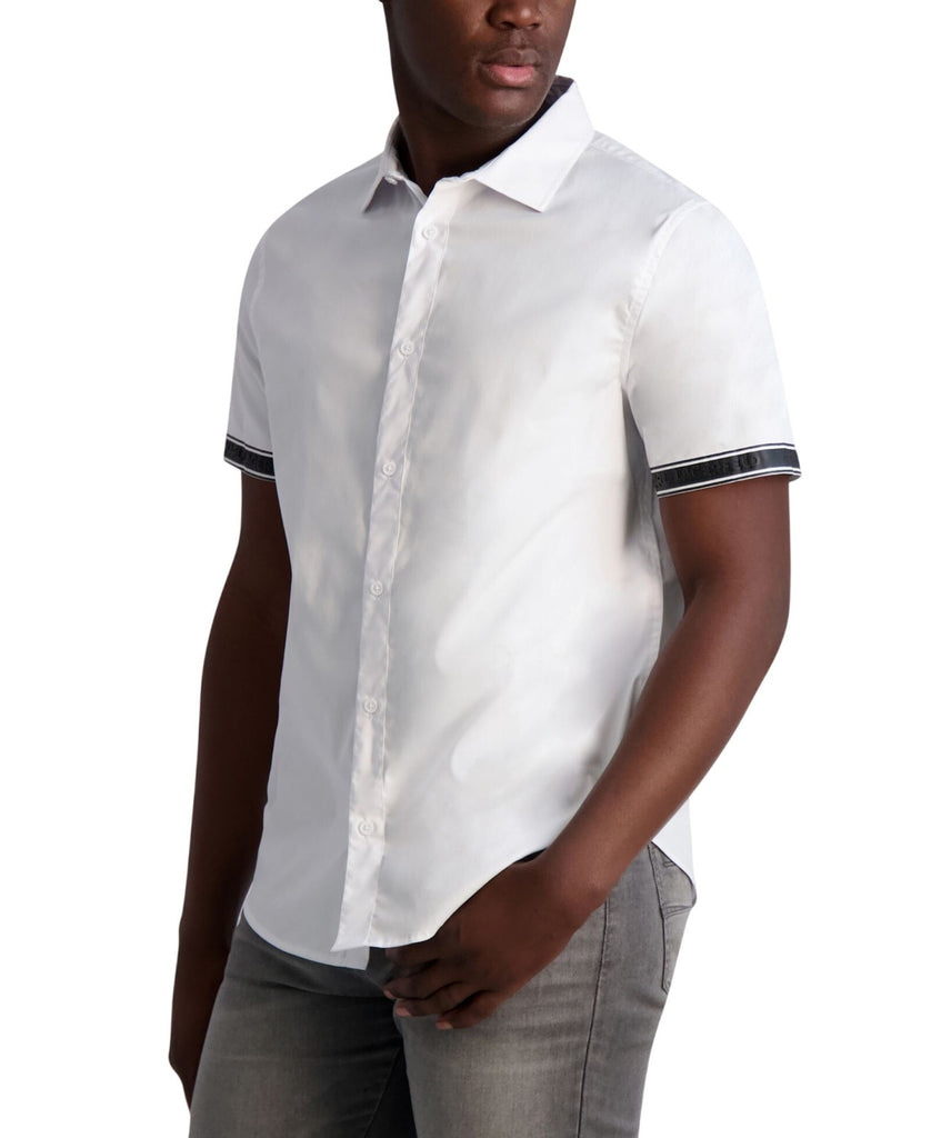 Looking stylish and modern in a slim fit, this short-sleeve shirt from Karl Lagerfeld Paris features logo tape at the sleeves for added appeal.