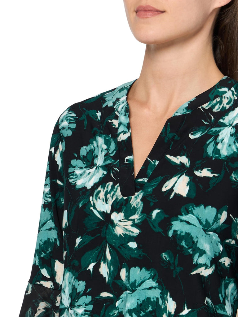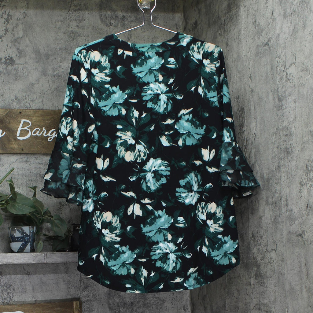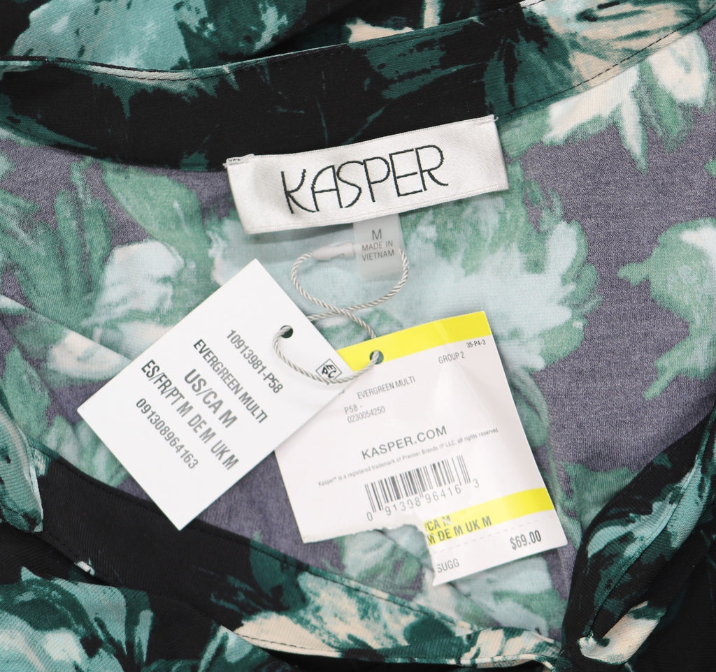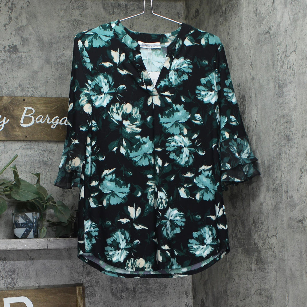 Beautiful 3/4-length bell sleeves frame this split-neck top from Kasper, while a painterly floral print finishes it in style.