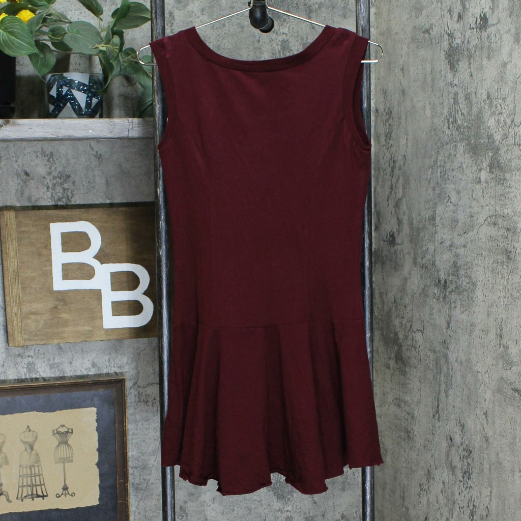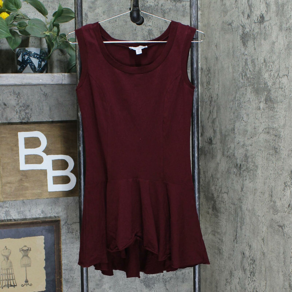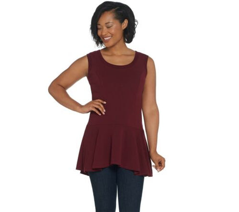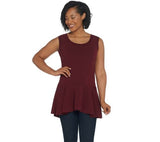 Features: princess seams, rib knit trimmed armhole and neckline, hi-low hem, sleeveless