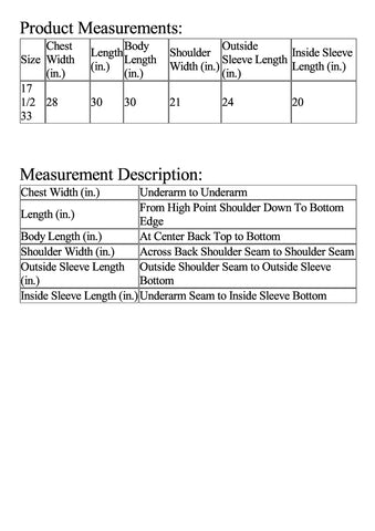 | Size | Chest Width (in.) | Length (in.) | Body Length (in.) | Shoulder Width (in.) | Outside Sleeve Length (in.) | Inside Sleeve Length (in.) |