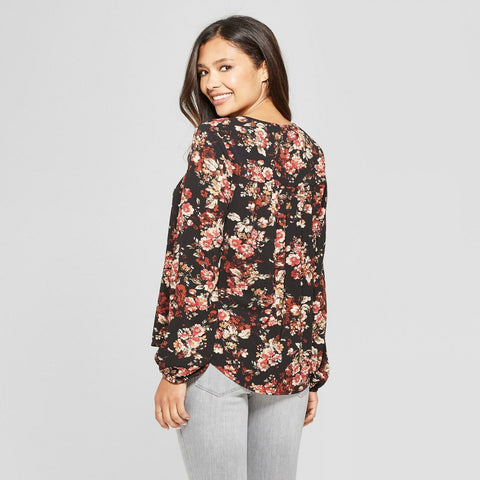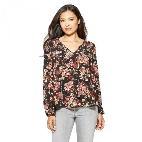 Add pretty flower power to your look with the Floral-Print Long-Sleeve Peasant Top from Knox Rose. This long-sleeve printed peasant top features an allover pattern of pink florals on a black background for contrast that pops. The V-neck peasant top design features tasseled ties, which add swingy style and movement to the relaxed-fit blouse. Pair it with gray or black denim for a polished look, or go all in on hippie style with blue jean bell bottoms.