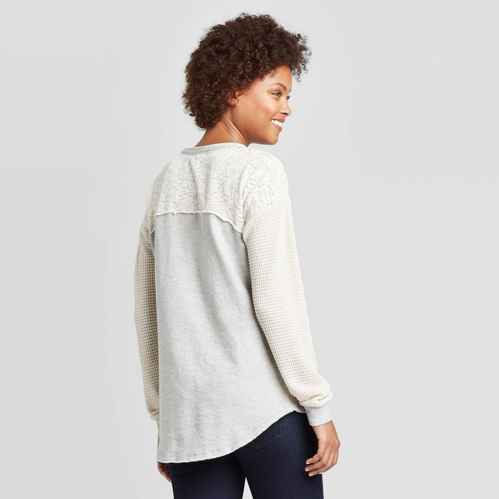 Sweeten up your casualwear with the Long-Sleeve Crewneck Sweatshirt from Knox Rose. This women's sweatshirt has a classic silhouette through the neck and sleeves, but gets a feminine touch from a curved hemline and lace detailing along the neckline and shoulders. Waffle-knit sleeves give it a cozy look, while 100% cotton keeps it lightweight enough for comfortable wear even when it's warmer out. A mauve velvet ribbon along the chest adds just a hint of color to the gray and white sweatshirt. Tuck into a black pleated midi skirt for a day at the office, or pair with your favorite leggings and slipper socks for a movie night with friends.