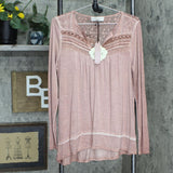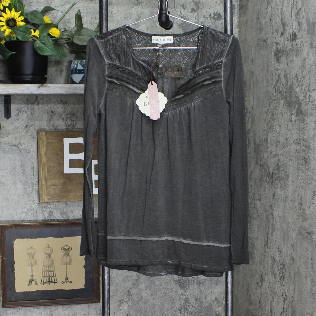 This Long-Sleeve Split-Neck Oil-Wash Top from Knox Rose makes for a cute and comfy alternative to a basic long-sleeve tee, thanks to dainty details adding a bit of elegance. The split-neck design is complemented with subtle ruffles on the front, while the back features a delicate pintuck lace panel for added texture. The allover oil-wash look makes for a unique color and texture, while a slightly flowy fit moves with you comfortably no matter where your day takes you. Comfy enough for a casual weekend look, you can also easily dress it up with dark denim and heeled booties.