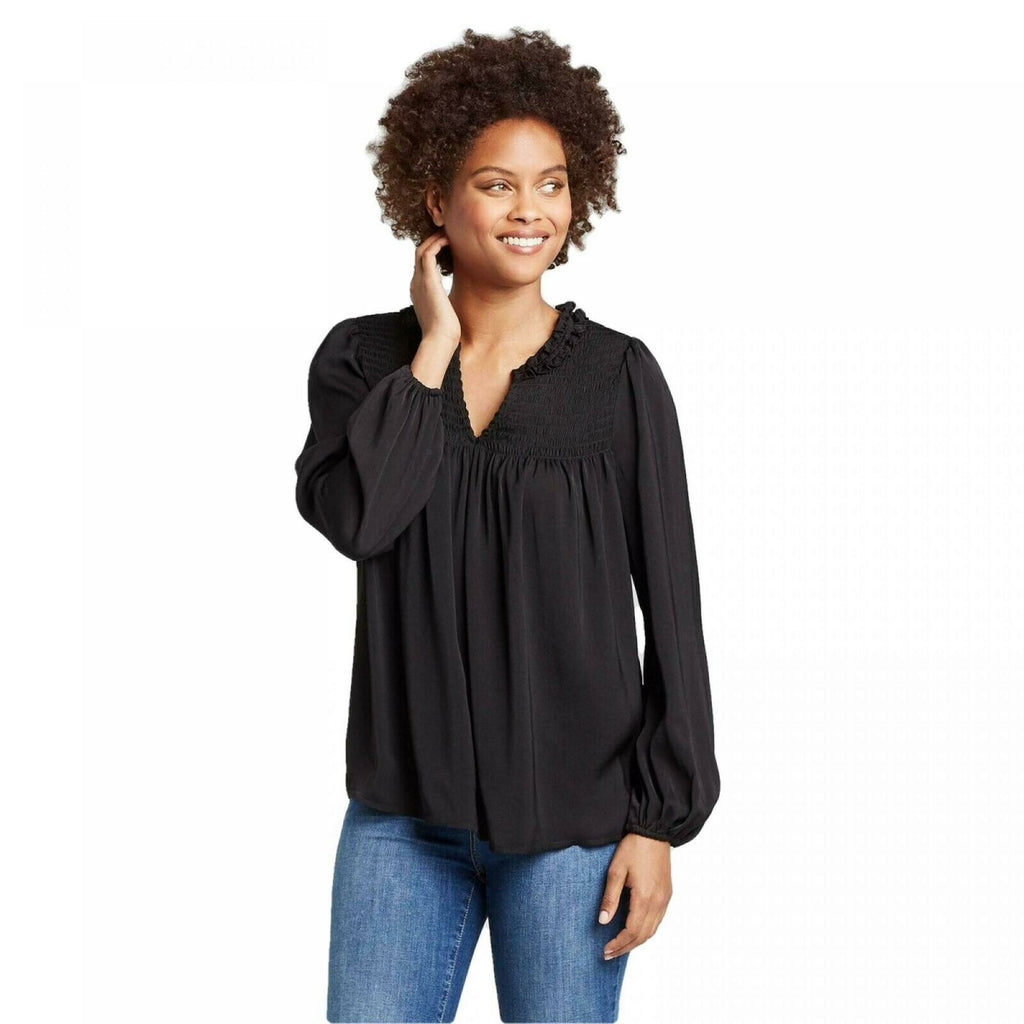 Make a simple and stylish statement with the Long-Sleeve Split-Neck Blouse With Smocking from Knox Rose. This puff-sleeve blouse is designed with subtle peasant top details for a versatile look that provides plenty of shape and texture without going full flower child. A split-neck design makes for easy on and off, while smocked details around the neckline add subtle texture to the look. On the back of the blouse, a pretty lace panel features delicate floral designs to dress up the solid color. Just add denim whether it's blue jeans or your favorite pastel hue and your choice of accessories for an effortlessly elegant look in no time.