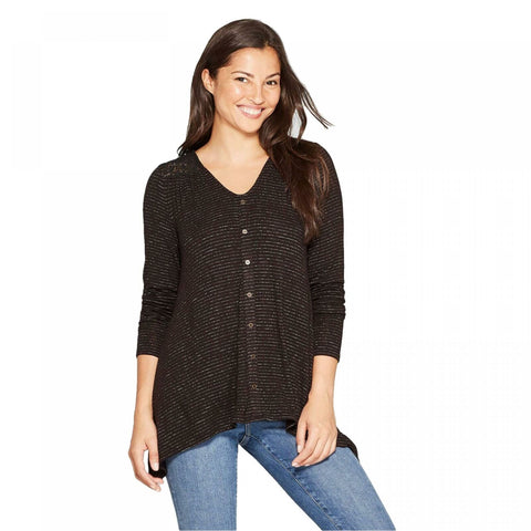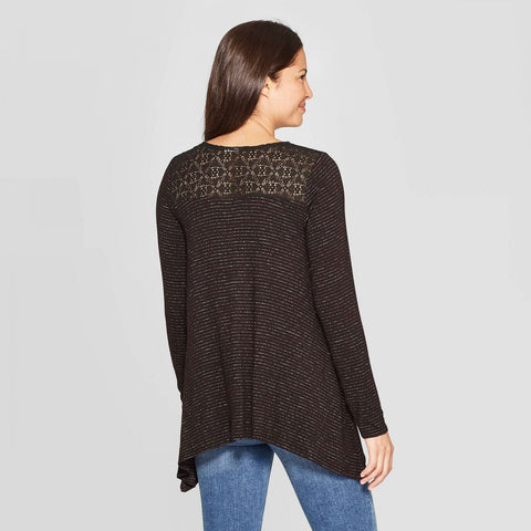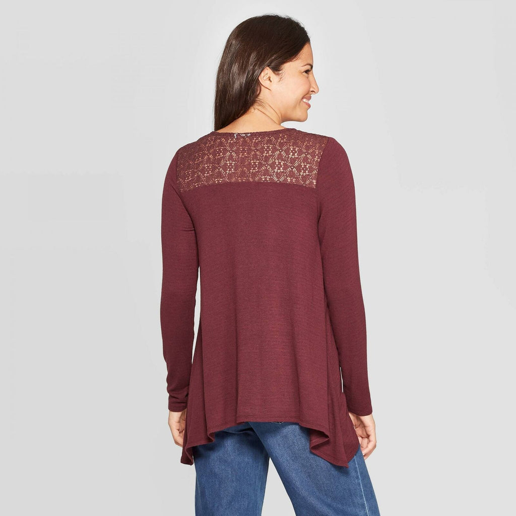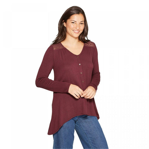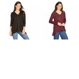 Bring a bit of dainty style to your casualwear with the Long-Sleeve Button-Front Blouse from Knox Rose. Styled with a V-neck and long sleeves, the bodice of the blouse gently cascades from the neckline into a subtle handkerchief hem for a look that is soft, feminine and flowy. A button-down design lends a touch of laid-back style, perfectly balanced by the lace-like material on the shoulders and back yoke. All you need to complete your look is a pair of jeans and flats.