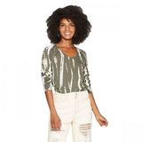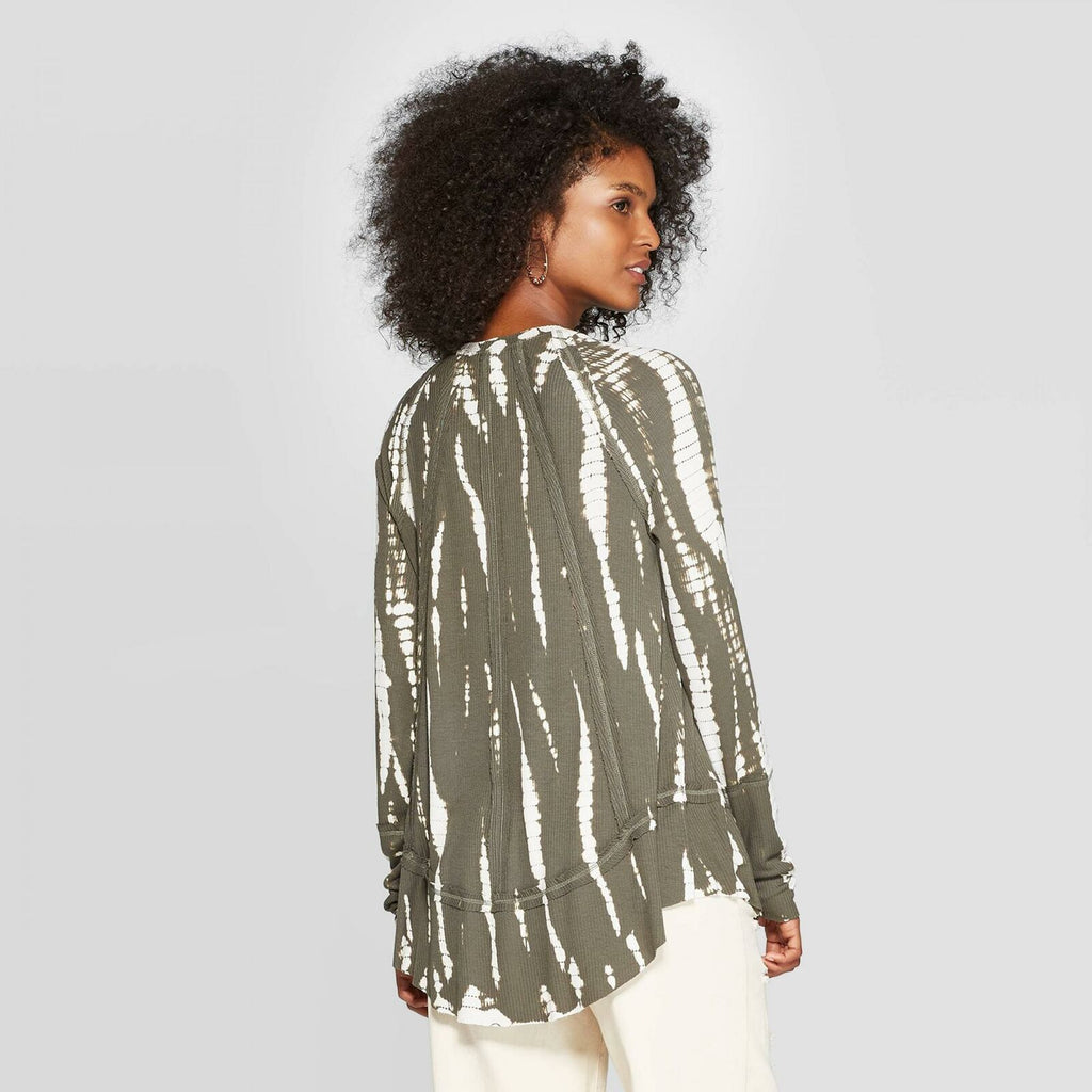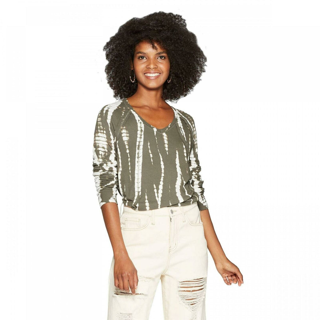 Bring cool, laid-back style to your everyday wear with the Long Raglan Sleeve V-Neck Blouse from Knox Rose. Crafted from a soft fabric that drapes beautifully, this green long-sleeve top will let you glide through your day in comfort and chic style. Reaching below the waist, this long-sleeve top features a rib-knit texture and it's accented with an allover tie-dye print in white for a bright pop. The V-neckline blouse is finished with long raglan sleeves, frayed accents and a curved hemline to give you a versatile top that you can wear tucked in or tucked out with all your go-to bottoms.