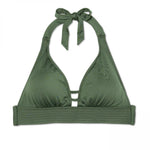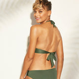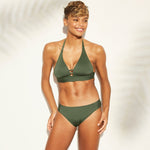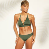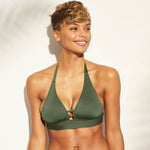 For a simple, stylish swim option, opt for the Triangle Bikini Top from Kona Sol. This dark green bikini top is made from a smooth, slightly stretchy nylon-spandex blend to keep you comfortable, and it features a back tie and behind-the-neck tie for a secure fit. You can even remove the soft cups to get as much or as little coverage and shaping as needed.