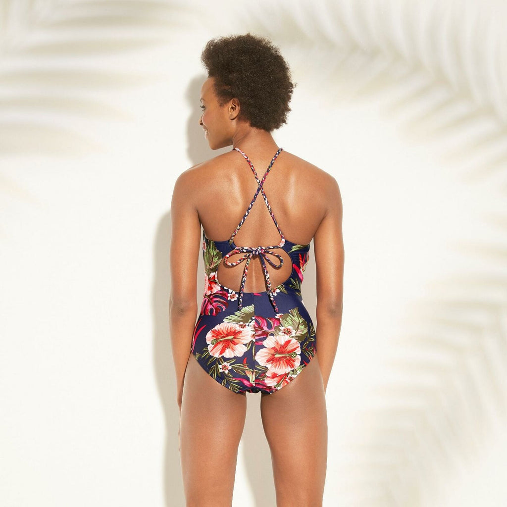 Make a sweet and stylish statement for your next trip to the beach in the Keyhole Braided Strap One-Piece Swimsuit from Kona Sol. This navy one-piece swimsuit features colorful floral blooms, and it gets an extra dose of style from the keyhole detailing along the neckline. A braided strap that crisscrosses in the back lets you tie it for a comfortable fit. The sewn-in cups offer extra coverage and shaping, and UPF 50+ protection provides confident wear as you spend your day under the sun.