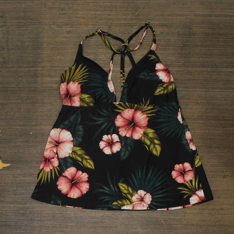 Take to the beach or boardwalk with the Ring Strappy Back Tankini Top from Kona Sol. This women's swim top features a classic tankini design that provides a little extra coverage over the midsection and sports a brilliant floral pattern on black for an elegant look that is perfect for catching a few waves or walking along the boardwalk. It’s made from comfortable fabric with added spandex for stretch and mobility. A pullover design makes it easy to slip on, and it features adjustable straps over the shoulders with ring detailing so you can find the right fit every time you wear it. Sewn-in cups offer extra comfort and support for hours of beach-side comfort.