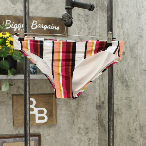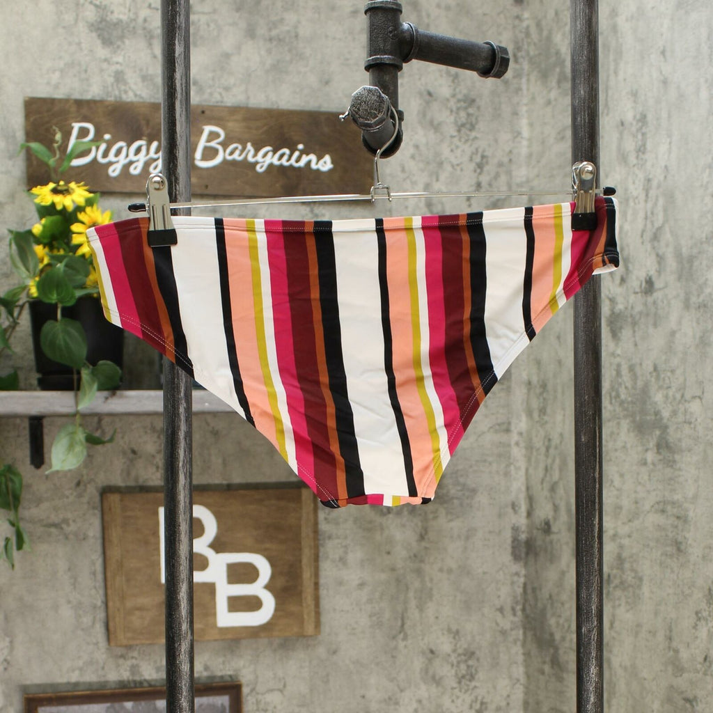 Let your colorful personality shine with the Medium-Coverage Striped Hipster Bikini Bottom Multicolor from Kona Sol. With a moderate-coverage cut for ease of movement, these multicolor-stripe bikini bottoms are a great balance of style and function. Vertical stripes of varying widths keep things interesting, while the spandex blend keeps you comfortable both in the water and out of it. Pair these with a coordinating striped bikini top or change things up with a solid black or white bikini top to keep your options open.