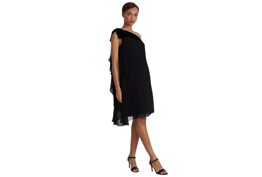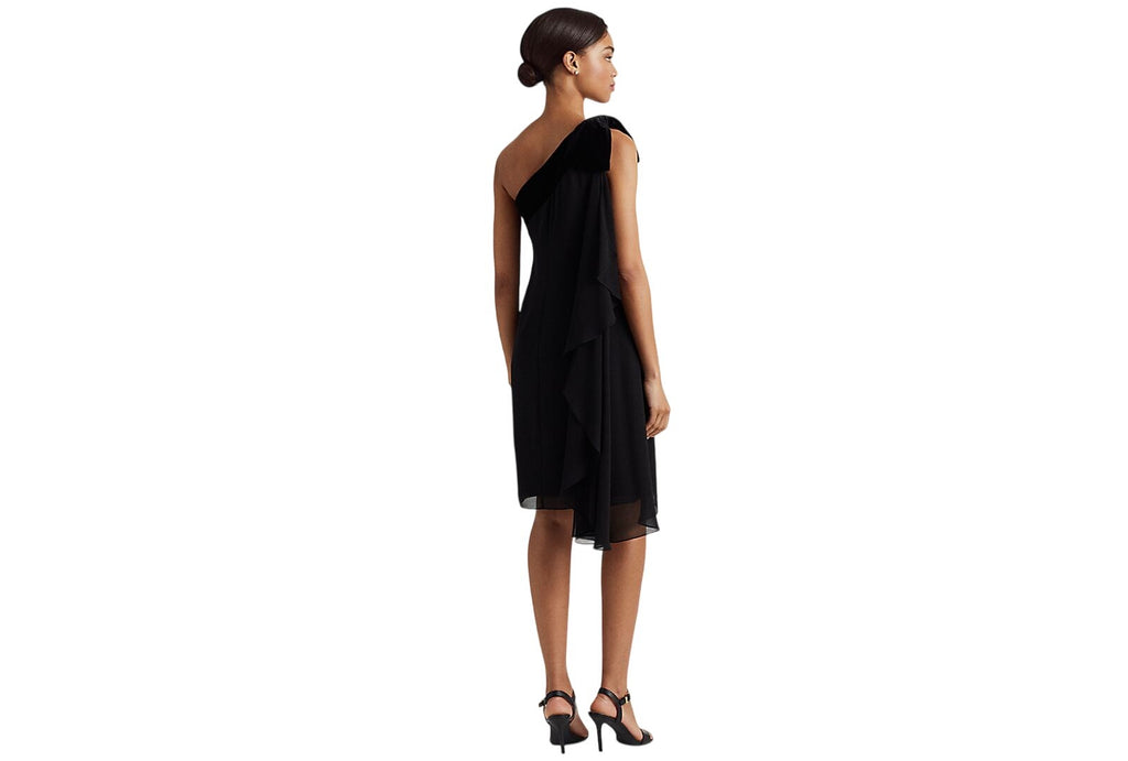 This modern one-shoulder dress pairs airy georgette with plush velvet. It features charming details like a feminine bow at the shoulder and a sweeping georgette drape. 94% Polyester, 6% Elastane. Imported. Hook and Eye closure. Dry Clean Only. This modern one-shoulder dress pairs airy georgette with plush velvet. It features charming details like a feminine bow at the shoulder and a sweeping georgette drape. Slim fit. Intended to hit at the knee. Size 8 has a 34" body length. Dress length is taken from the center back of the neck and changes ¼" between sizes. One-shoulder silhouette. Concealed side-seam zipper with a hook-and-eye closure. Velvet neckband with bow at the right shoulder. Cascading ruffle trim down the right side. Bust darts. Fully lined. Shell and lining: polyester. Neckband and bow: polyester, elastane. Dry clean. Imported. SHELL: 100% POLYESTER (RECYCLED) ,NECK BAND: 92% POLYESTER 8% ELASTANE ,BOW: 92% POLYESTER 8% ELASTANE ,LINING: 88% POLYESTER (RECYCLED) 12% ELASTANE. Vietnam