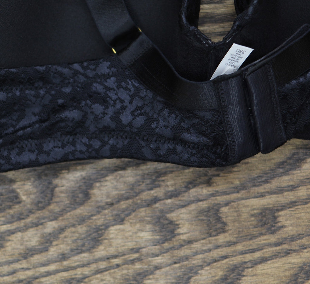 Wings lined with power mesh for additional support V neck cut to wear with lower necklines Gold LM logo charm 3 row, 2 hook back closure for sizes 32C-E, 34C-D, 36C and 38C, 3 row, 3 hook back closure for sizes 32F, 34E-F, 36-38D-F and 40C-F