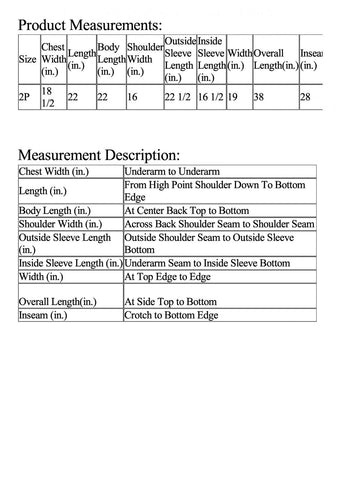 | Size | Chest Width (in.) | Length (in.) | Body Length (in.) | Shoulder Width (in.) | Outside Sleeve Length (in.) | Inside Sleeve Length (in.) | Width (in.) | Overall Length(in.) | Inseam (in.) |