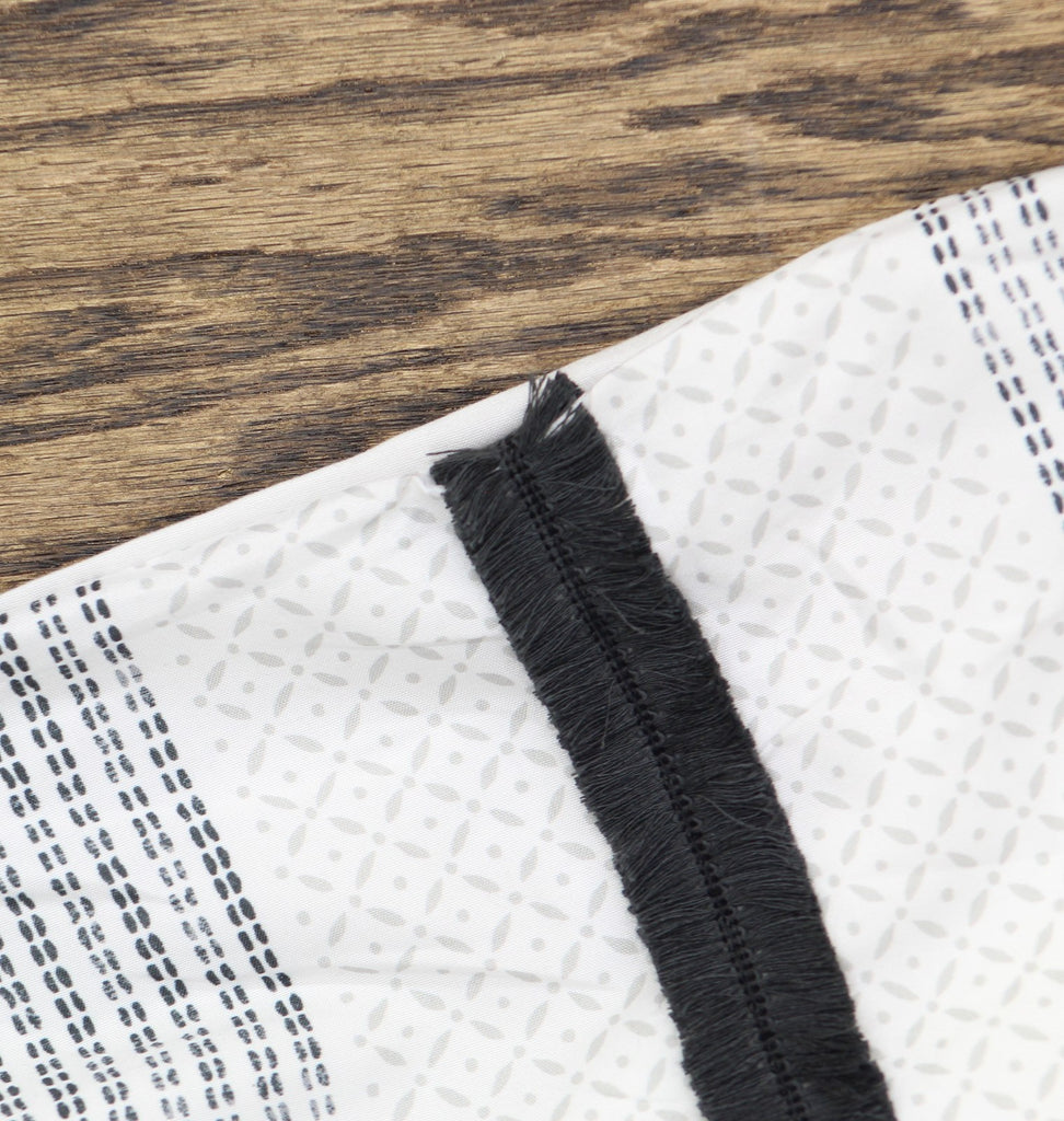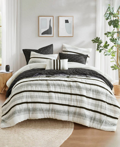 The Madison Park Carolina 7-Piece Stripe Comforter/Quilt Set, featuring stripes and coastal boho trim. This set effortlessly combines modern style with easy maintenance. Features Dimensions: 1 Comforter: 104" x 92", 2 King Shams: 20" x 36" Set includes: 1 Comforter, 2 King Shams Medium warmth, perfect for year-round use. Asian American & Pacific Islander Owned, Woman Owned 100% polyester Machine washable Imported