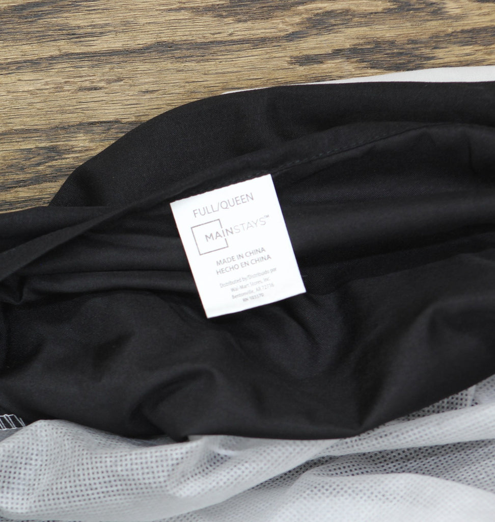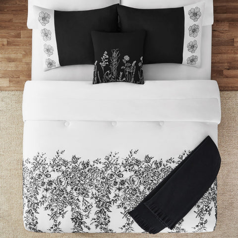 The Mainstays 5 Piece Sketch Floral Comforter Set in size Full/Queen brings a charming floral motif in a contemporary style to your guest or master bedroom. This comforter set includes 1 comforter, 2 shams, 1 embroidered decorative pillow and a throw. The comforter is made from a soft and cozy 100% Polyester microfiber with white on the front and black on the reverse. The front is then covered in a lovely black floral embroidery, providing a beautiful contrast against the white fabric. It is packaged in a reusable bag as a bonus item. All of these features come at an incredible value where you can be confident that you will get your money's worth and also enjoy a stylish, comfortable bedding ensemble for your space. Imported. Adult, Unisex 5 piece comforter set Mainstays 5 Piece Sketch Floral Queen Comforter Set includes 1 Comforter (88`` x 92``), 2 Shams (20`` x 26``), 1 decorative pillow (16`` x 16``), 1 throw (50`` x 60``) with a bonus self fabric bag Care Instructions: Use front load commercial washer and dryer, machine wash cold delicate, wash separately. Use only non-chlorine bleach when needed, tumble dry low, remove promptly. Cool Iron if necessary. Pillows: Spot Clean Fabric Content: 100% Polyester Microfiber Face, Microfiber solid back, down alternative polyfill, and bed skirt uses non-woven platform with microfiber drop All Season: The midweight down alternative polyfill offers sufficient warmth in the winter and cool comfort in the summer for year-round satisfaction Style: The contemporary, clean look of the Sketch Floral Comforter Set can transition into many different styles of bedrooms for a sophisticated and beautiful decor. Sizes: This product is available in Full/Queen and King Sizes
