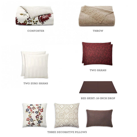 Set include: comforter, bedskirt, two shams, two European shams, throw and three decorative pillows