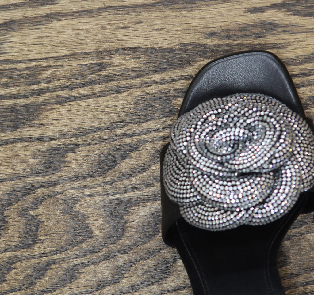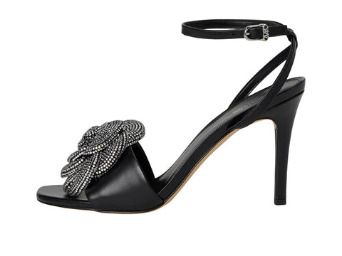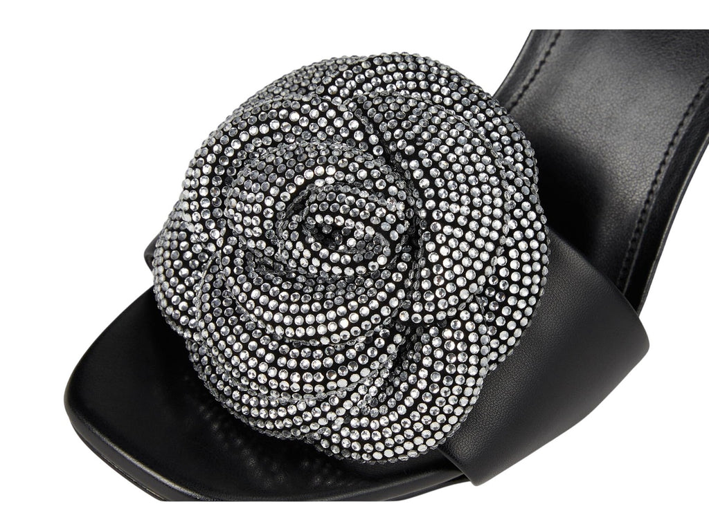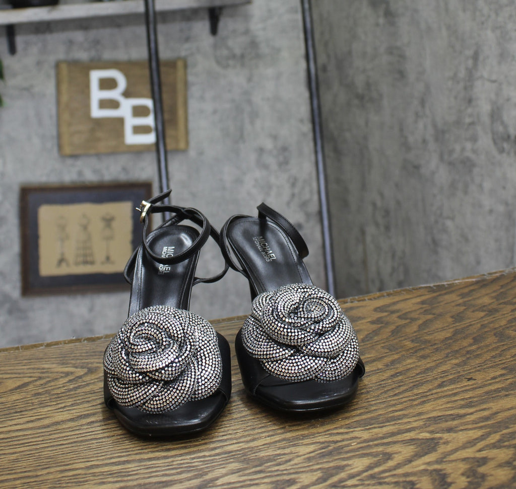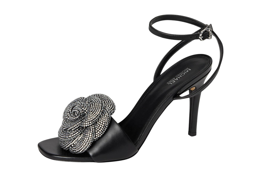 Bigtime rhinestone blooms add undeniable style to the lofty look of the Elodie dress sandals from MICHAEL Michael Kors. Features Stiletto heel: 3-1/2" Square toe Signature adjustable buckle closure 3D rhinestone rosette at vamp Upper: leather; lining: manmade; sole: rubber Imported
