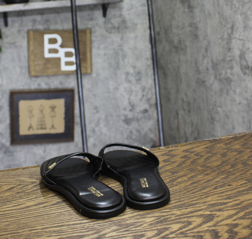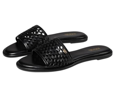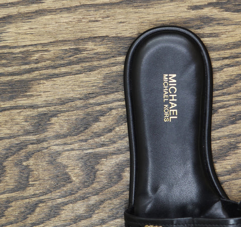 Strut in your distinctive yet comfy style wearing the MICHAEL Michael Kors Saylor Slide Flat Sandals. This slip-on footwear features leather upper construction with synthetic lining and insole. Open round toe silhouette. Synthetic outsole. Imported. Measurements: Heel Height: 1 4 in Weight: 7 oz Product measurements were taken using size 8.5, width M. Please note that measurements may vary by size.