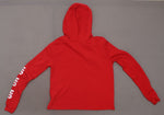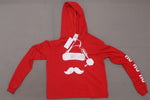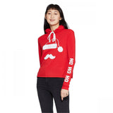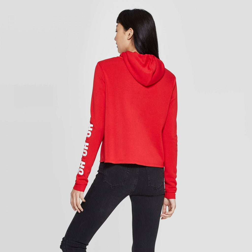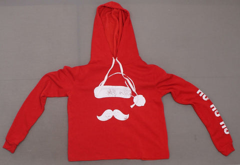 Tis the season for holiday fun. Show it off with this cute hoodie with "Ho Ho Ho" sleeve print and an abstract Santa print front. An extra pop is added with the white drawstring.