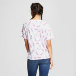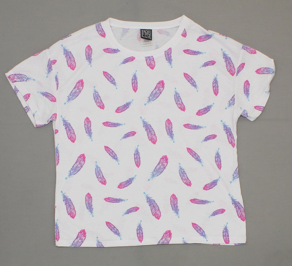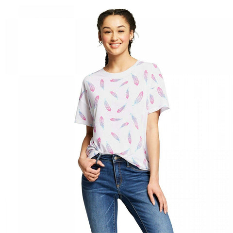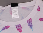 Flowy crew neck tee with an all-over feather print.