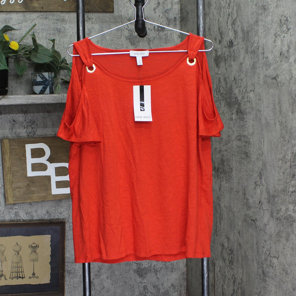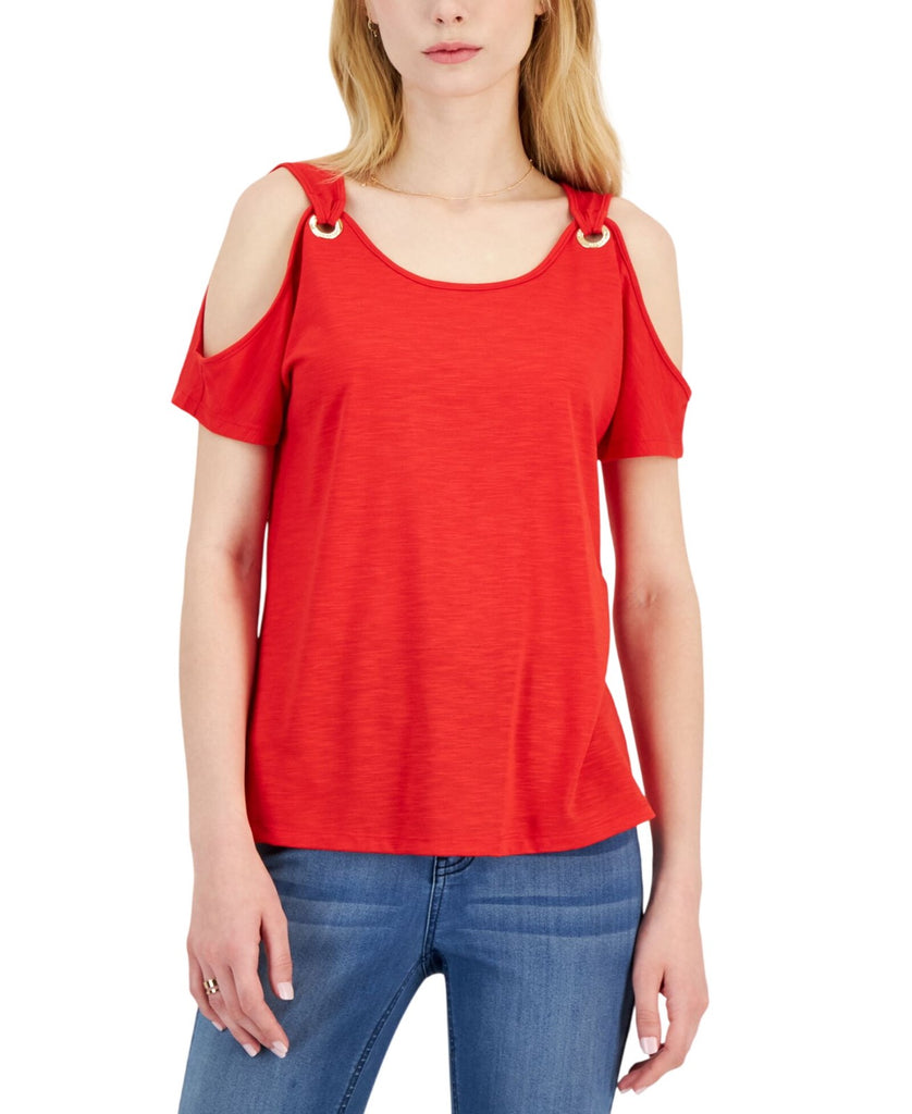 Elevate your casual look with this Nine West top, an easy fit in textured fabric punctuated with gold-tone rings and cold shoulders.