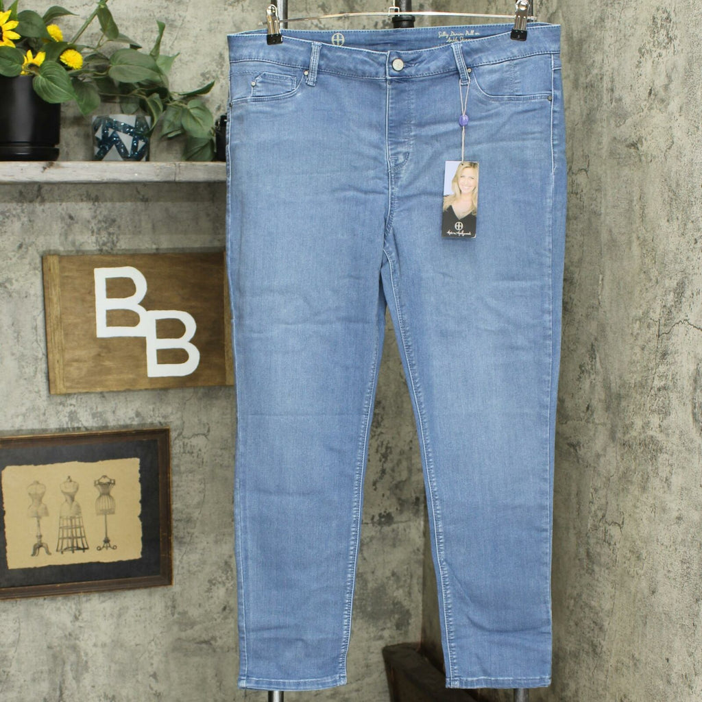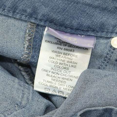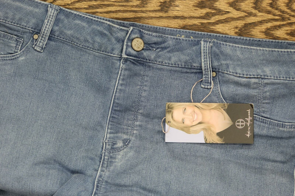 Features: ankle-length design, pull-on style, button closure, belt loops, two back pockets, faux front pockets, coin pocket, logo on back pocket
