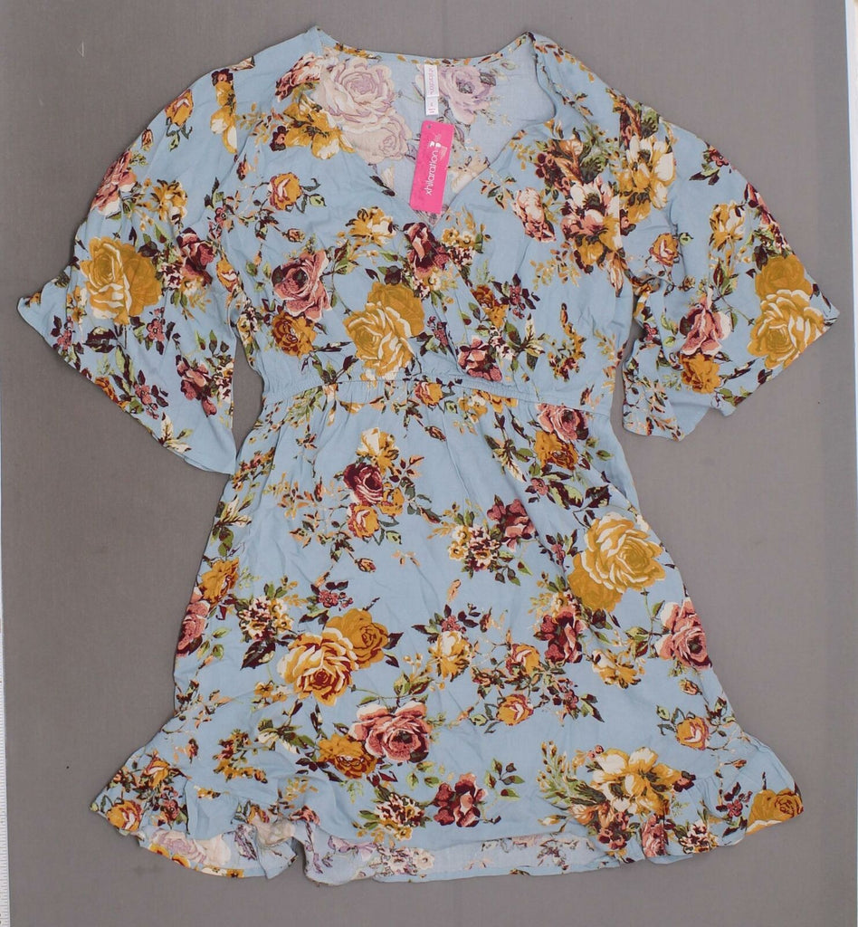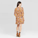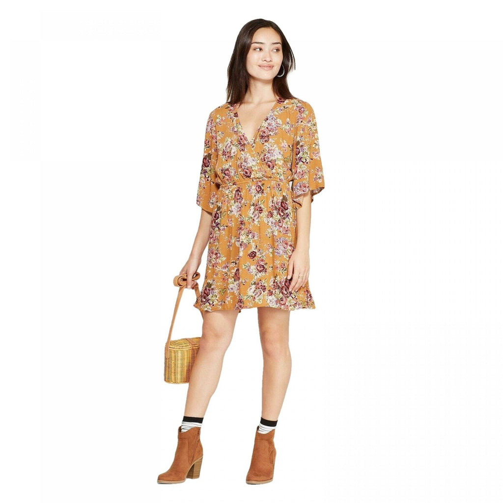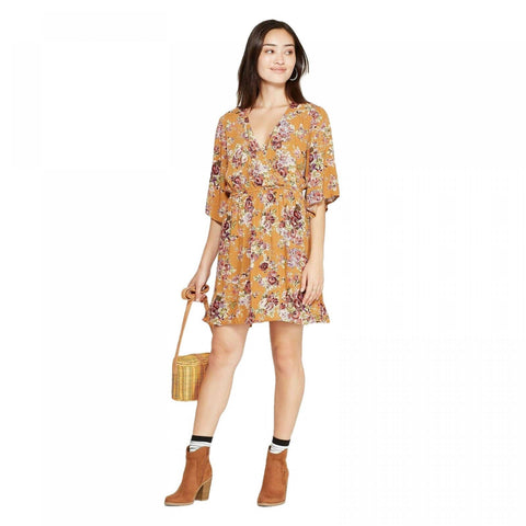 This Floral-Print Short-Sleeve V-Neck Dress from Xhilaration adds a sweet touch of style to sunny days and fun nights out. This V-neck mini dress features an allover colorful floral print that beautifully stands out against a mustard-yellow background, and it's cut in a faux-wrap style with a cinched waist to create a flattering, feminine look. You'll love the V-neckline and elbow-length sleeves that complete the chic style. Pair this floral V-neck dress with strapthe V-neckline and elbow-length sleeves that complete the chic style. Pair this floral V-neck dress with strappy sandals and colorful earrings for a complete look.