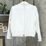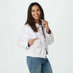 Hardware: zip front under branded snaps placket