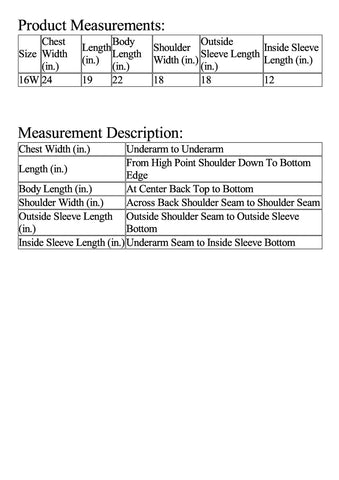 | Size | Chest Width (in.) | Length (in.) | Body Length (in.) | Shoulder Width (in.) | Outside Sleeve Length (in.) | Inside Sleeve Length (in.) |