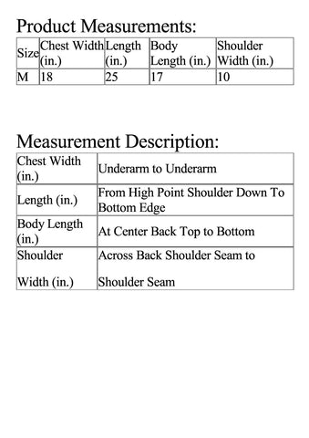 | Size | Chest Width (in.) | Length (in.) | Body Length (in.) | Shoulder Width (in.) |