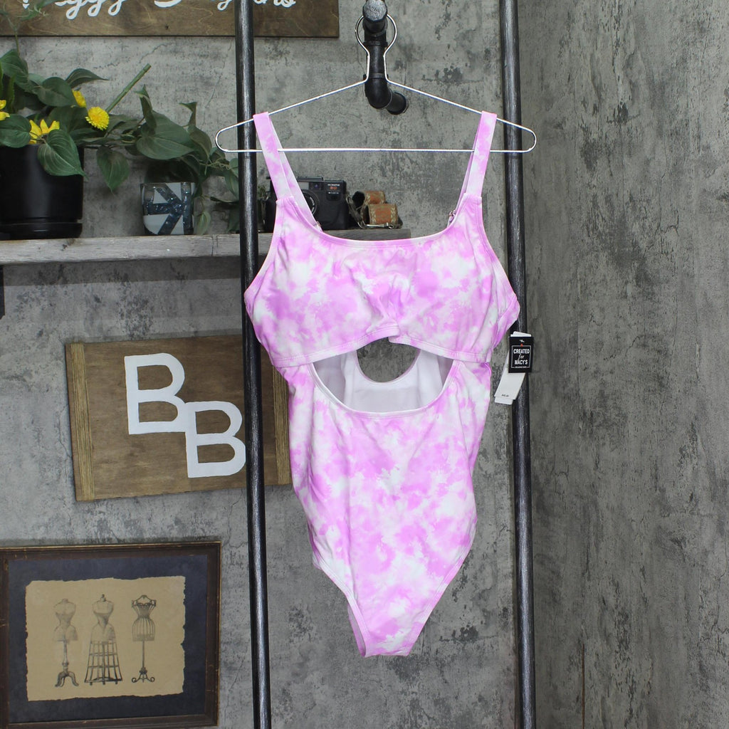 Features:. Play peek-a-boo at the beach in California Waves' plus size one-piece swimsuit. This tie-dyed style features midriff cutouts in front and back. Removable cups. Moderate bottom coverage. Adjustable shoulder straps; S-hook closure at back. Scoop neckline; cutout at front waist. Cutouts at front and back midriff. Lined. Hand wash.. Style #: CWP22185. Nylon/spandex; . Lining: polyester. Imported.