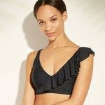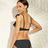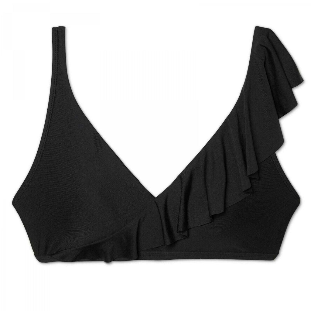 Coverage doesn't have to be boring, and the Ruffle Bikini Top from Sea Angel proves it. This black bikini top has a shallow V-cut that provides more coverage than a traditional triangle bikini. The look is taken up a notch with an asymmetrical ruffle running diagonally from one shoulder for a flirty touch. Adjustable straps make it easy to get your ideal fit, while the back hook closure keeps the ruffled bikini top secure so you can take on your beach activities with confidence. The basic black color opens you up to tons of options for styling — pair with solid black bottoms for a more refined look, or go bolder with brightly colored patterned bottoms.