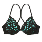 Enjoy a day lounging on the beach or floating in the pool with this Shore Light Lift Bikini Top from Shade & Shore. This halter bikini top has a dazzling cut-out pattern that has pops of light blue peeking through gorgeous black detailing. It offers lift to your bust with an underwire and molded cups for an alluring look. This black and light blue bikini top features an adjustable tie-back closure for a sure and secure fit while you're swimming or relaxing by the water.