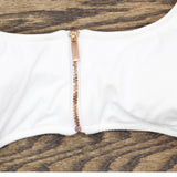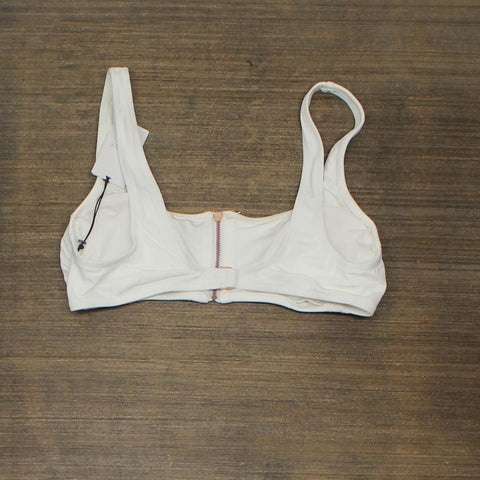 Chic and sassy style make the Zipper Tank Bralette from Shade and Shore a fun piece in your swimwear collection. You’ll love the crisp look of a bright white hue, coupled with a gold-finished zipper down the bralette for a touch of glamour and luxe. Gathered detail graces the side of the bust for a bit of dynamic style, and a rounded square neckline pairs with over-the-shoulder straps for sleek and minimal flair. Slip into the matching bottoms for a cohesively glamorous look, or you can style yourself an eclectic ensemble with patterned bikini bottoms.
