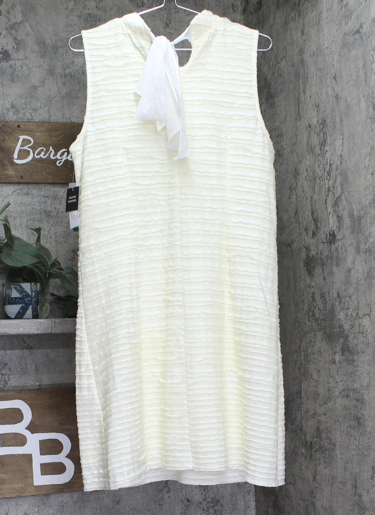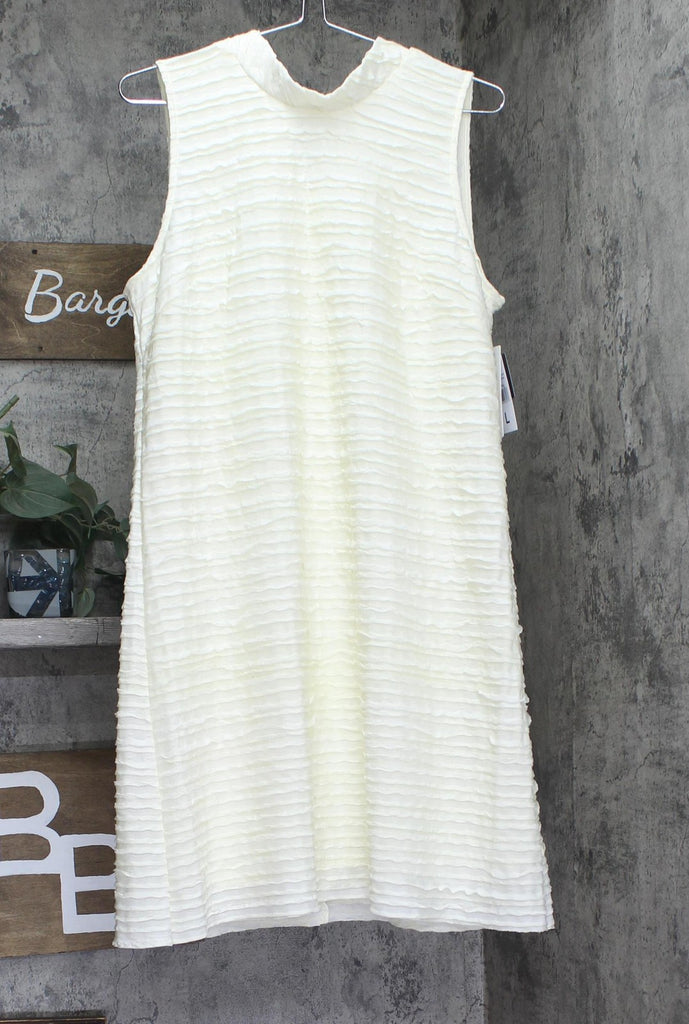 Wavy mini ruffles give texture and a 3D tone to the streamlined design of this chic Robbie Bee shift. Finished with a tie at the back neck, it moves from workday to evening dinner with ease. Features Approx. 35" long from center back neck to hem. Length varies 1/4" between sizes Mock neck Fitted through the chest and arms; sits away from the body through the waist and hips Tie closure at back neck Sleeveless Lined XS=0-2, S=2-4, M=6-8, L=10-12, XL=14-16 95% polyester, 5% spandex; lining: 100% polyester Machine wash Imported