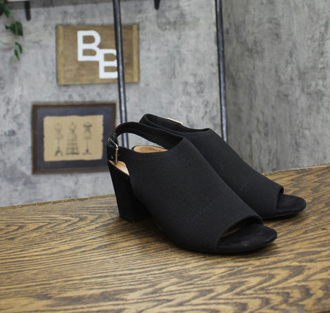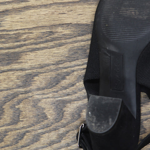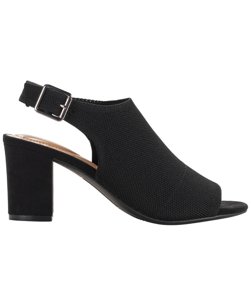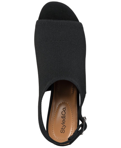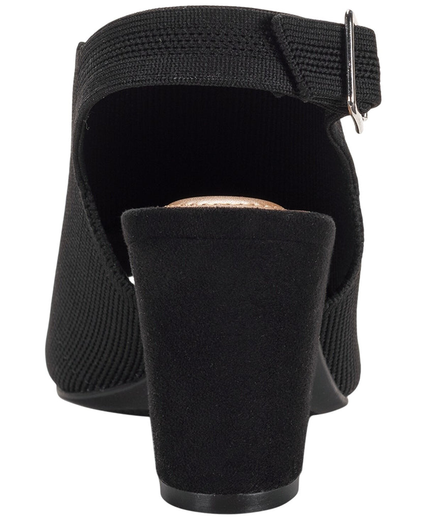 Buckled slingbacks and block heels define a stylish lift in the Peyyton shooties from Style & Co. Features Heel: 2-1/2" Round toe Slip on, buckled slingback strap Cushioned insole for added comfort Outsole made with at least 20% recycled thermoplastic rubber Exclusive Upper: fabric; lining: unlined; sole: manmade Imported