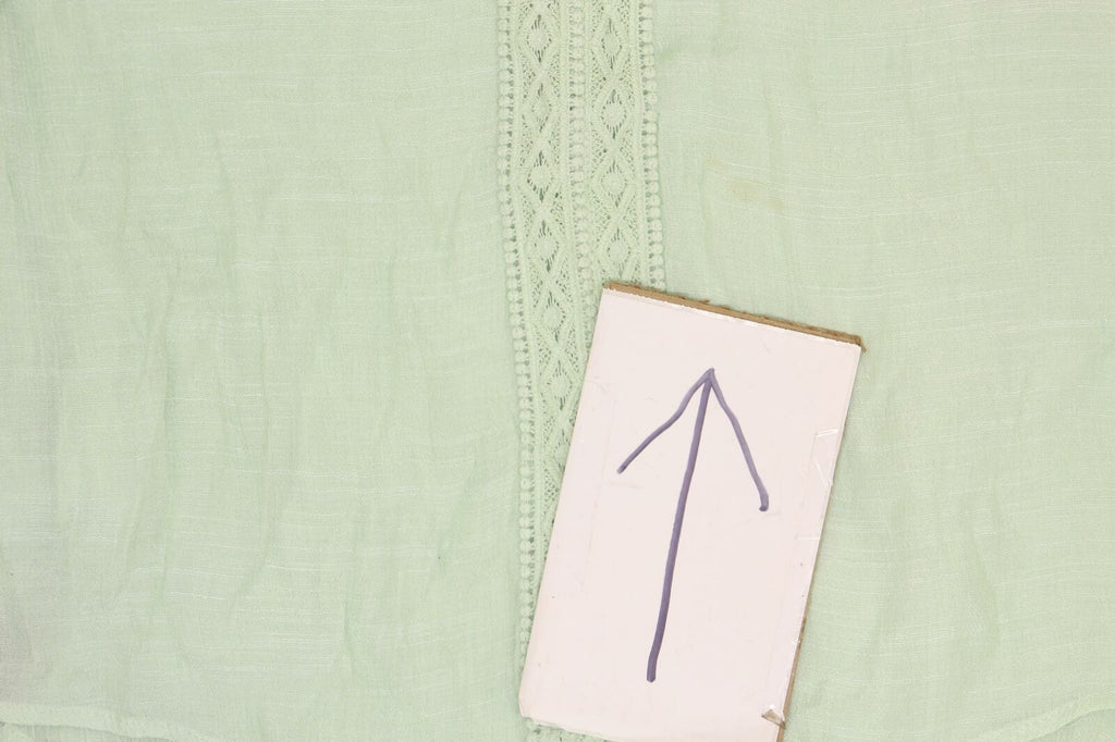 Crochet trim at neckline and sleeve inset; lace at yoke; layered hem