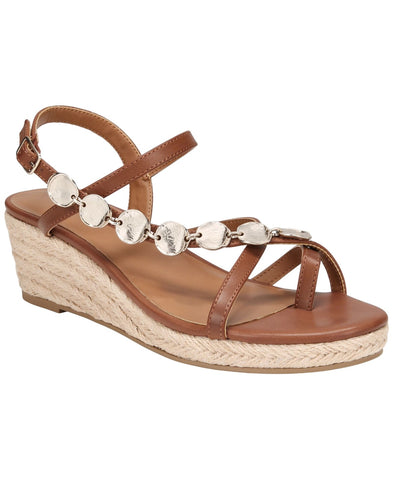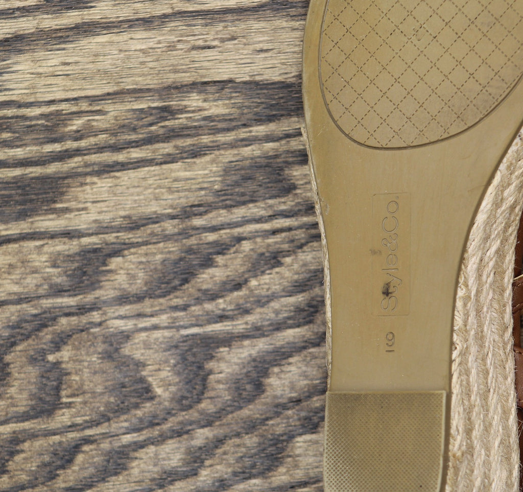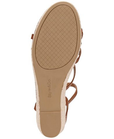 Trimmed in gold-tone charms and chains, the Style & Co Vernn sandals elevate a warm-weather boost with inspired flash and espadrille wedges. Features Espadrille wedge heel: 2-1/4"; platform: 3/4" Open toe Slip on, buckled slingback strap Hardware detailing at straps Exclusive Upper: manmade; lining: polyurethane; sole: manmade Imported