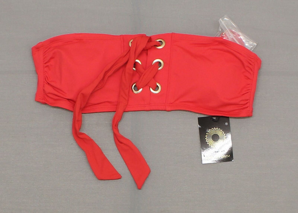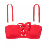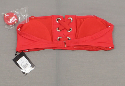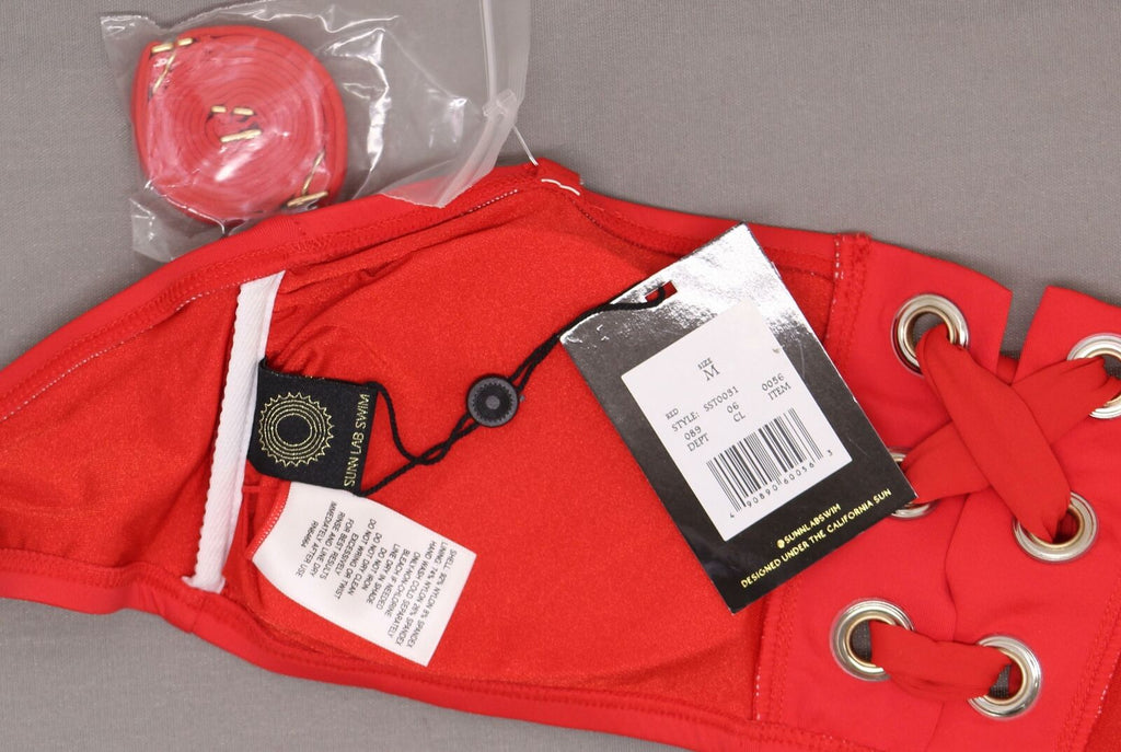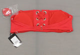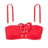 Add a flirty pop of red to your swimwear collection with the Grommet Bandeau Bikini Top from SUNN LAB SWIM. This red bandeau bikini top features a lace-up grommet detail in the front for a striking feminine look, and comes with detachable shoulder straps for added security and comfort. This top is made from nylon-spandex blend materials for softness and just the right amount of stretch, and a hook fastener in the back and removable cups help ensure coverage and a comfortable fit no matter where your day takes you. Whether you’re planning a beach vacation or just an afternoon at the pool, do it in style in this red bikini top.