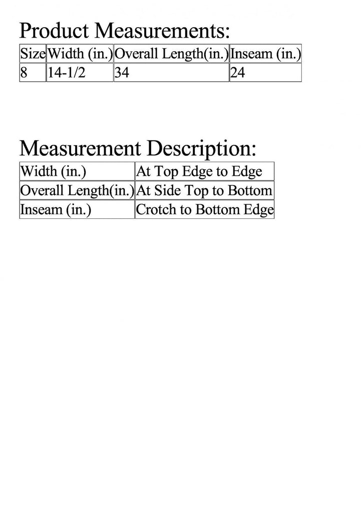 | Size | Width (in.) | Overall Length(in.) | Inseam (in.) |