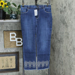 Features: belt loops, two back pockets, two front pockets with one coin pocket, front and back embroidery, frayed bottom hem