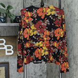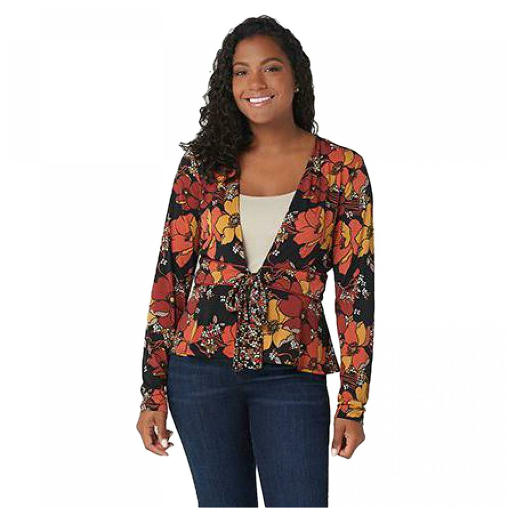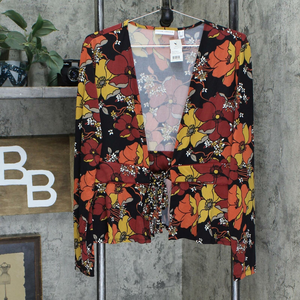 Features: tie-front detail, V-neckline, long sleeves, allover print, piping detail at the waist