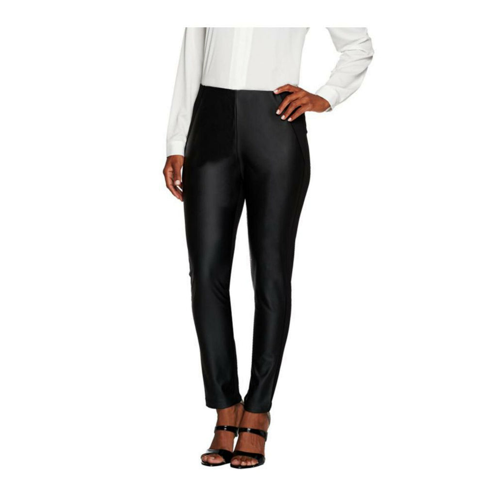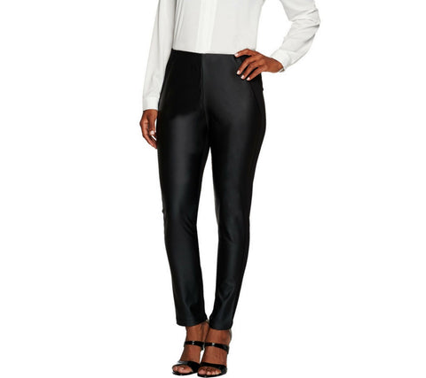 Book girls' night now. You'll want somewhere fabulous to show off these Susan Graver faux leather-front pants for the first time. They have an edgy air that makes you walk a little taller, but belies their flexible fit thanks to an elastic comfort waist and ponte-knit back. From Susan Graver.