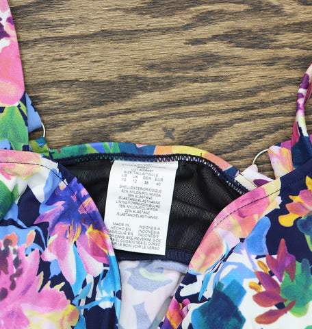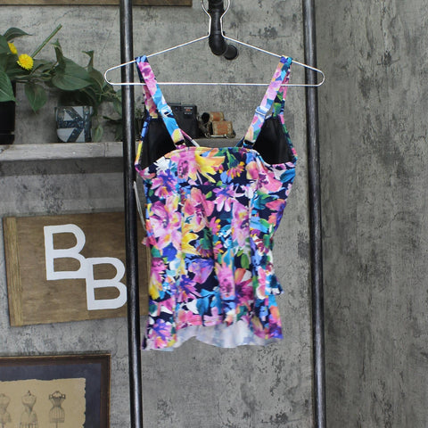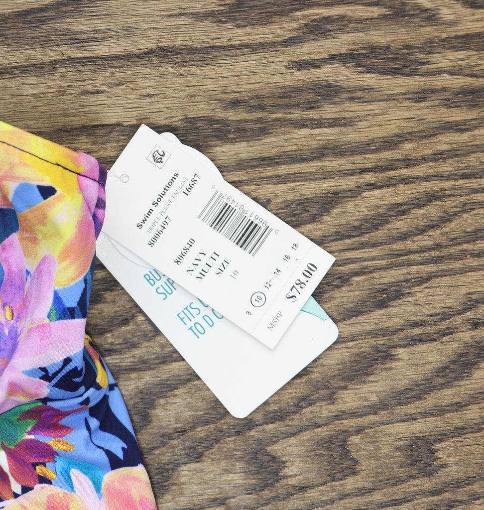 TRIPLE-TIER DESIGN: Stylish tankini top featuring three elegant tiers of ruffles that create a flattering silhouette and provide excellent coverage VIBRANT PATTERN: Navy multi-colored floral print with a stunning mix of pink, yellow, purple, and turquoise blooms for a garden-inspired look SUPPORTIVE FIT: Wide shoulder straps and sweetheart neckline provide comfortable support and an attractive neckline shape VERSATILE STYLE: Perfect for mixing and matching with solid swim bottoms, ideal for beach or pool wear QUALITY CONSTRUCTION: Durable swim fabric maintains shape and color, with a comfortable fit in women's size 10