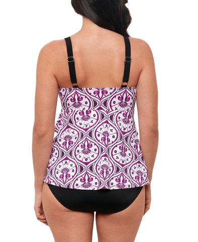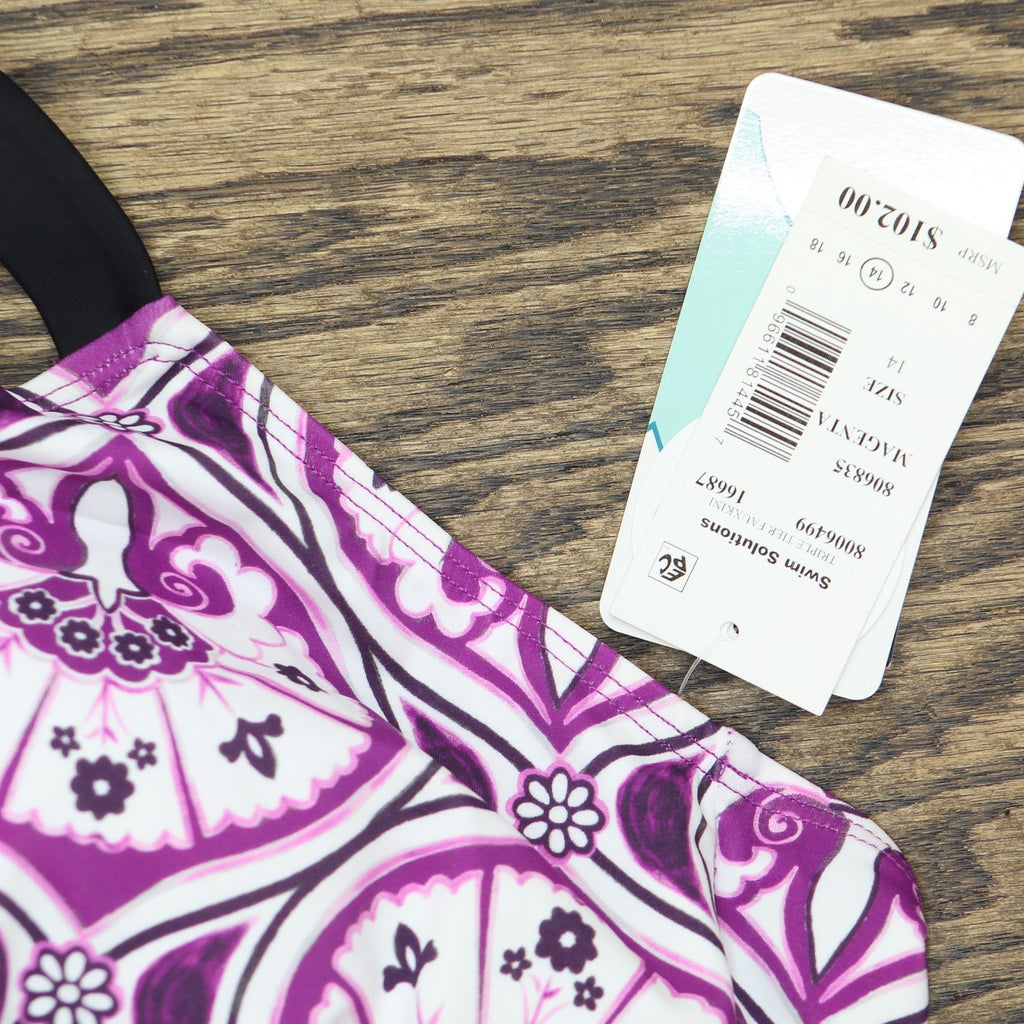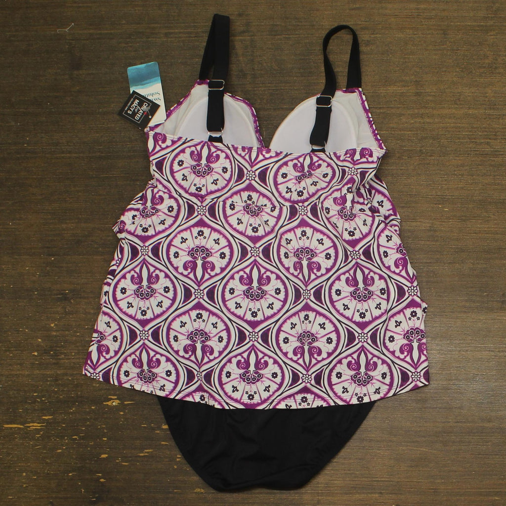 STYLISH DESIGN: Tiered fauxkini one-piece swimsuit featuring a stunning magenta and white floral pattern with elegant geometric details FLATTERING FIT: Tiered design creates a slimming silhouette while providing comfortable coverage and support ADJUSTABLE STRAPS: Black shoulder straps with adjustable buckles ensure a customized, secure fit VERSATILE STYLE: Classic one-piece construction combines the look of a tankini with the convenience of a single garment QUALITY CONSTRUCTION: Durable swimwear material maintains shape and color, perfect for regular pool or beach use